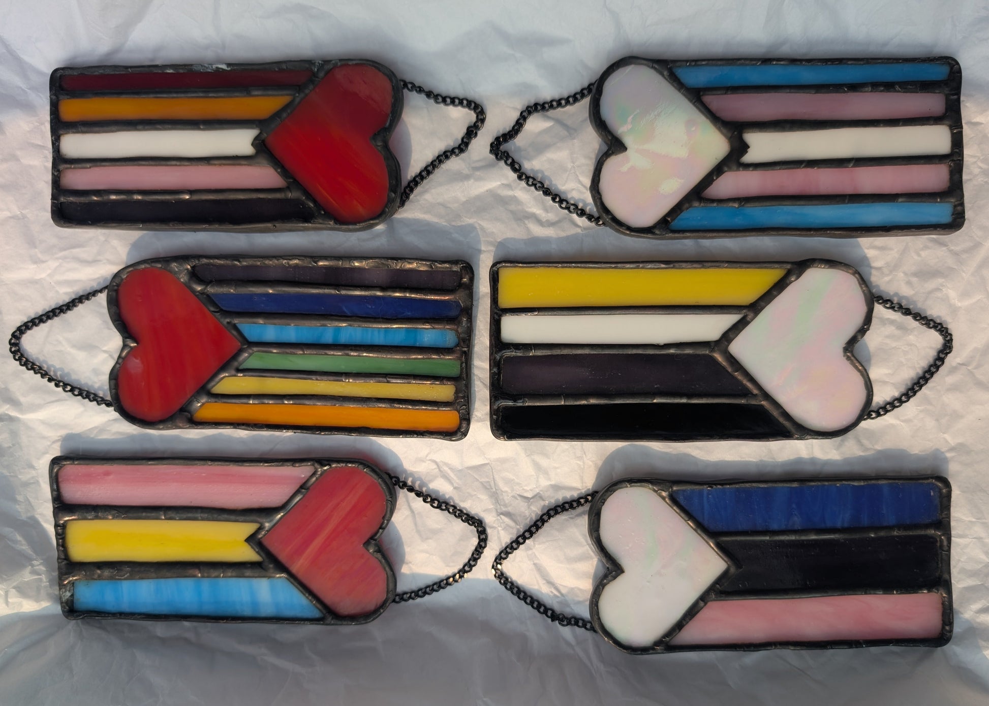Show your pride and let the light shine through with a Heart Pride Flag Suncatcher! Lovingly handcrafted in vibrant stained glass, each heart features the bold, beautiful colours of your chosen pride flag—celebrating identity, love, and community with every ray of sunlight it catches.